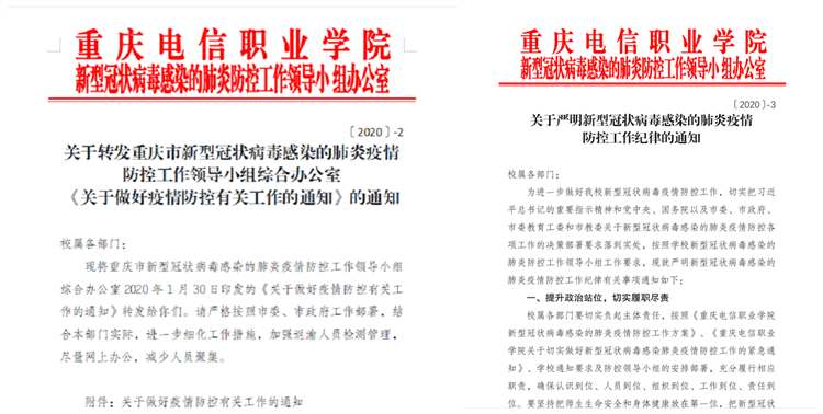 1月31日,在参加完全市教育系统新型冠状病毒感染的肺炎疫情防控工作视频调度会议后,91视频网站在线观看以网络视频会议的形式召开新型冠状病毒感染的肺炎疫情防控工作专题会议,对91视频网站在线观看疫情防控工作再动员、再部署。转发《关于转发重庆市新型冠状病毒感染的肺炎疫情防控工作领导小组综合办公室<关于做好疫情防控有关工作的通知>的通知》,进一步严格按照市委、市政府工作部署,结合本部门实际,进一步细化工作措施,加强返渝人员检测管理,尽量网上办公,减少人员聚集。印发《关于严明新型冠状病毒感染的肺炎疫情防控工作纪律的通知》,严明新型冠状病毒感染的肺炎疫情防控工作纪律有关事项。