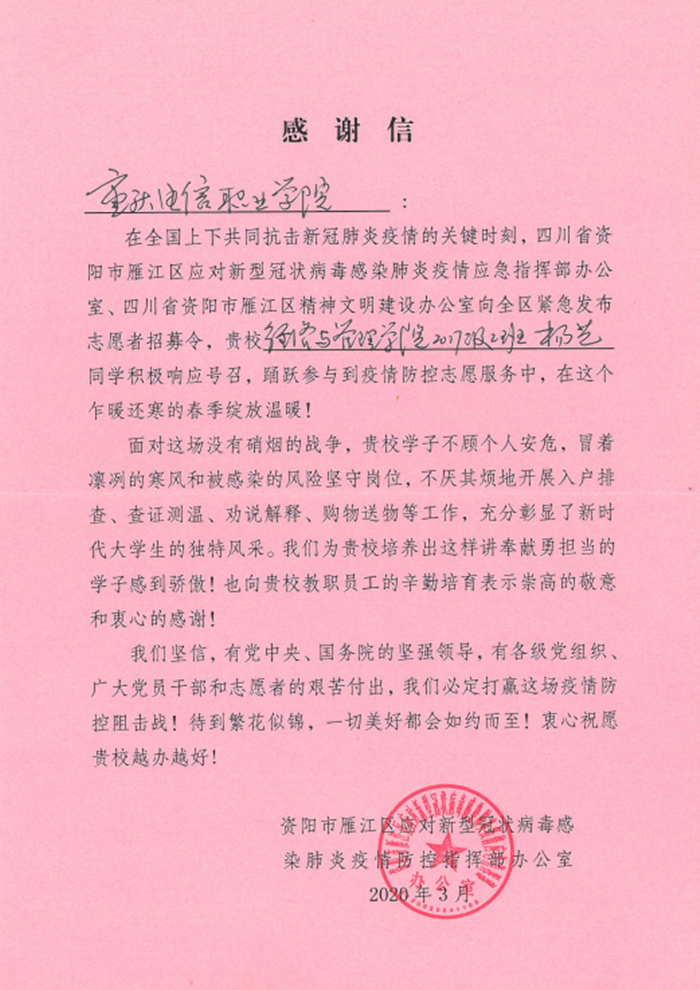 【疫情防控 电信在行动】抗疫情 暖人心——我校收到资阳市雁江区应对新型冠状病毒感染肺炎疫情防控指挥部办公室感谢信