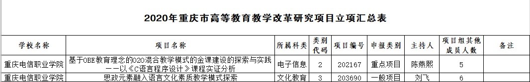 近日,从《重庆市教育委员会关于公布2020年度高等教育教学改革研究项目评选结果的通知》渝教高发〔2020〕9号文件中获悉 91视频网站在线观看,我校申报的2个教学改革研究项目,分别被评为重点项目,一般项目。