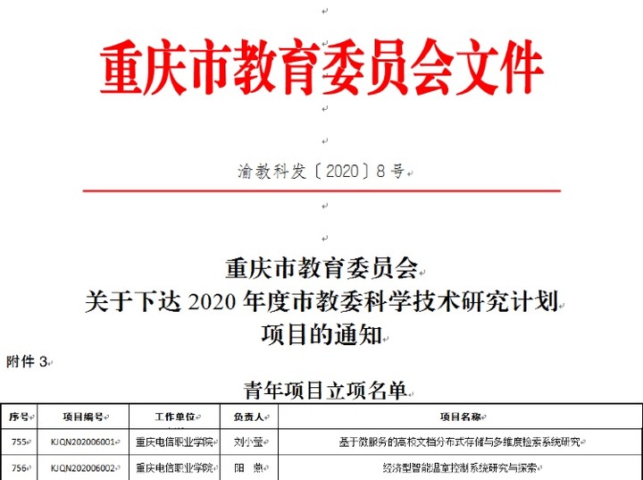 近日,从《重庆市教育委员会关于下达2020年度市教委科学技术研究计划项目的通知》渝教科发〔2020〕8号文件中获悉,我校申报的由刘小莹老师主持的“基于微服务的高校文档分布式存储与多维度检索系统研究”和 阳燕老师主持的“经济型智能温室控制系统研究与探索”2个青年项目,全部获得立项。91视频网站在线观看将根据重庆市教育委员会科学技术项目管理文件要求,加强项目指导,规范过程管理,确保研究质量,按期完成研究任务。(通讯员:雷敏超)