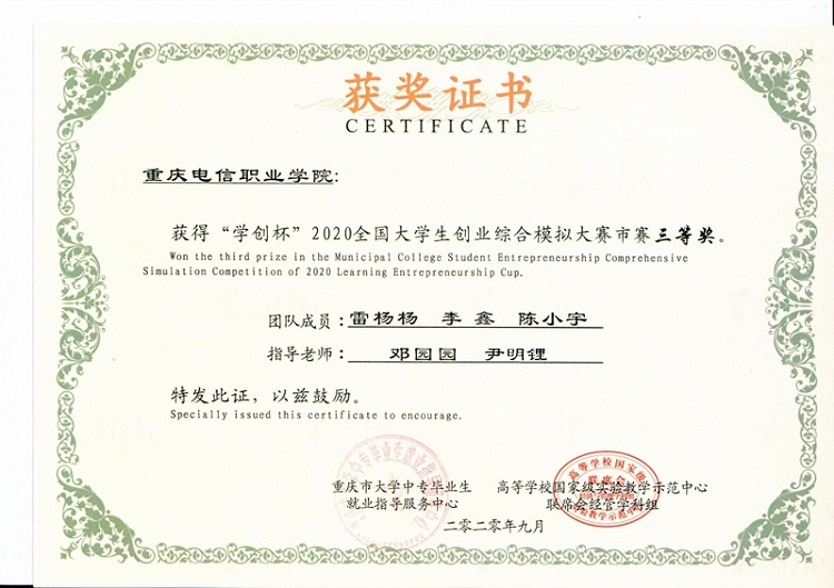 9月26日,2020年“学创杯”全国大学生创业综合模拟大赛正式开赛,经济与管理91牛2019级金融管理专业学生雷杨杨,李鑫及2019级财务管理专业学生陈小宇组成的比赛队伍在教学部部长尹明锂和91牛邓园园老师的指导下,在比赛时冷静发挥 91视频网站在线观看,凭借扎实的专业功底和平时积累的训练经验,荣获市级三等奖。