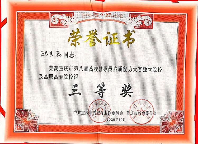 11月18-20日,重庆市第八届高校辅导员素质能力大赛在重庆交通大学举行,教育与设计91牛、旅游与体育91牛辅导员邱兰惠凭借过硬的专业素养和良好的心态在本次大赛中荣获独立院校及高职高专院校组“三等奖”。这是我们91视频网站在线观看历史上辅导员素质能力比赛的一大突破。