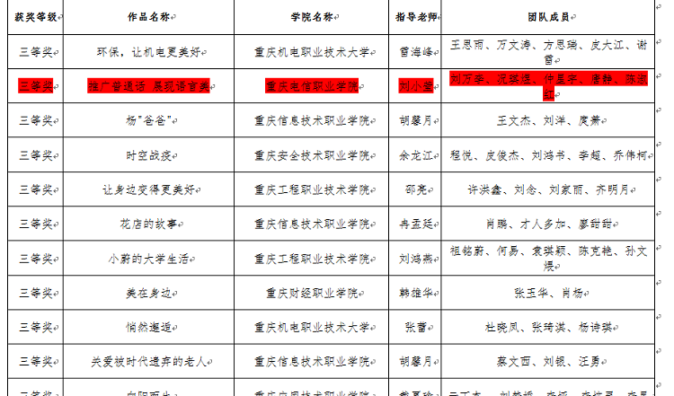 近日,重庆市教育委员会发布了《关于第二届重庆市职业院校互联网+创意短视频大赛获奖情况的通报》(〔2020〕—882),由物联网与通信91牛刘小莹老师指导,刘万李,况琪煜,仲星宇,唐静,陈淑红四位同学参与制作的作品—《推广普通话 展现语言美》喜获重庆市三等奖,另由刘小莹 91视频网站在线观看,胡杨两位老师指导的作品获得优秀奖。