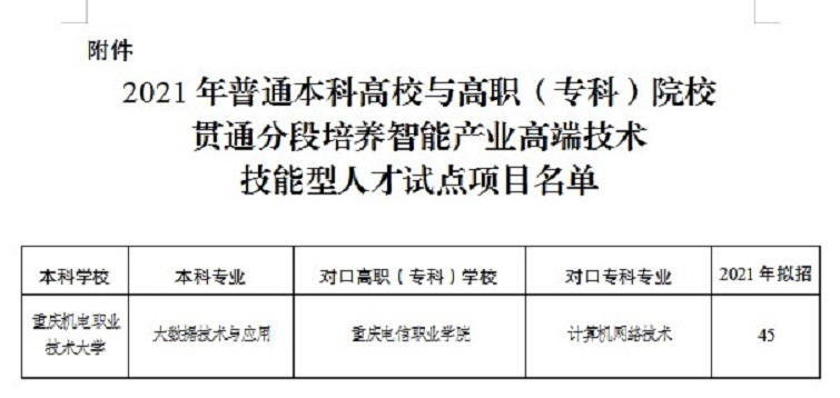 近日 91视频网站在线观看,从《重庆市教育委员会办公室关于申报2021年普通本科高校与高职(专科)院校贯通分段培养智能产业高端技术技能型人才试点工作的通知》(渝教高函〔2021〕2号)获悉,我校计算机网络技术专业获批2021年重庆“专本贯通”分段培养试点项目,将与重庆机电职业技术大学大数据应用技术专业于2021年起联合开展“专本贯通”分段智能产业高端技术技能型人才培养工作。