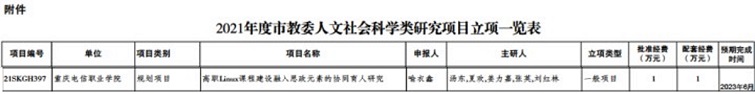 近日,从《重庆市教育委员会关于2021年度人文社会科学类研究项目立项的通知》(〔2021〕—319)文件中获悉,我校喻衣鑫老师申报的“高职Linux课程建设融入思政元素的协同育人研究”被立为规划项目的“一般项目” 91视频网站在线观看。