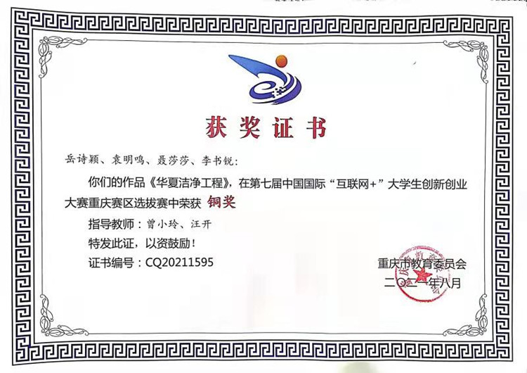 轨道交通91牛学子在2021年第七届中国国际“互联网+”大学生创新创业大赛重庆赛区选拔赛中“华夏洁净工程”创新创业项目荣获“青年红色筑梦之旅”赛道铜奖。