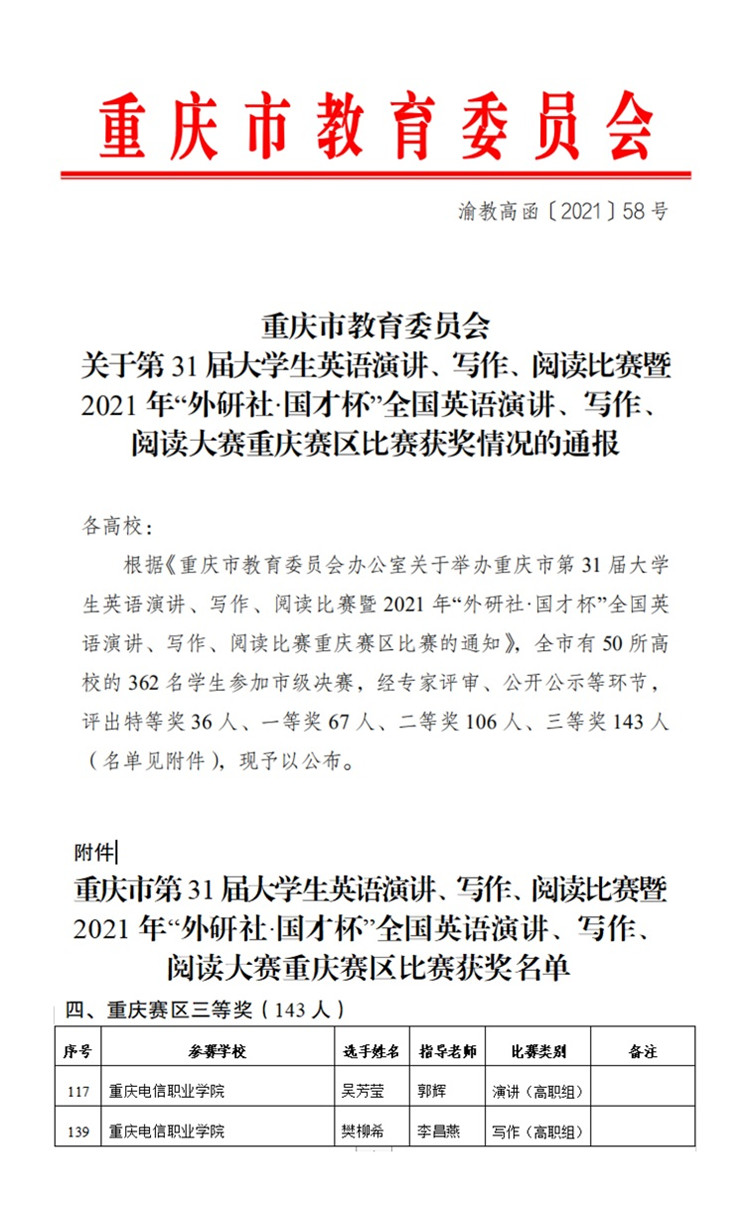 近日,从《重庆市教育委员会关于第31届大学生英语演讲,写作,阅读比赛暨2021年“外研社·国才杯”全国英语演讲,写作,阅读大赛重庆赛区比赛获奖情况的通报》(渝教高函〔2021〕58号)文件中获悉,我校郭辉 91视频网站在线观看,李昌燕两位老师指导的学生吴芳莹,樊柳希分别获得英语演讲,写作比赛重庆赛区三等奖。