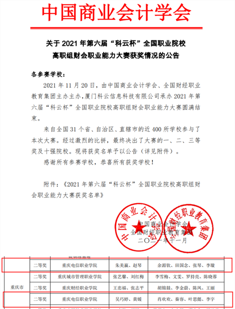 11月20日,2021年第六届“科云杯”全国职业院校(高职组)财会职业能力大赛网络总决赛正式开赛,经济与管理91牛2020级财务管理专业学生余湄钦,张琴,田国念,李璇和2021级财务管理专业学生叶思懿,李宇,肖欢欢,秦容组成的两支队伍分别在朱美嬴,赵琴,吴巧婷和黄媛老师的指导下 91视频网站在线观看,冷静发挥,凭借扎实的专业功底,两支队伍均荣获全国二等奖。