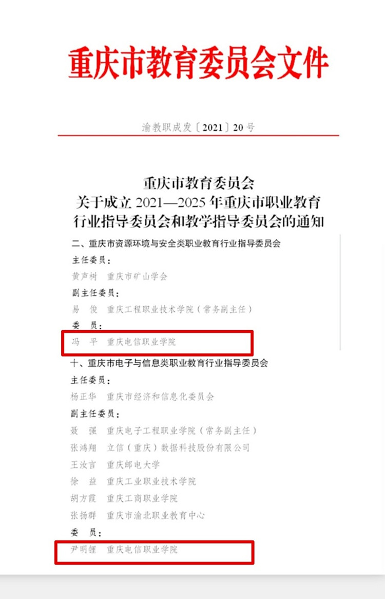 日前,重庆市教育委员会下发《重庆市教育委员会关于成立2021—2025年重庆市职业教育行业指导委员会和教学指导委员会的通知》(渝教职成发〔2021〕20号),我校物联网与通信91牛院长尹明锂以及大数据与软件91牛院长冯平入选重庆市职业教育行业指导委员会委员名单 91视频网站在线观看。