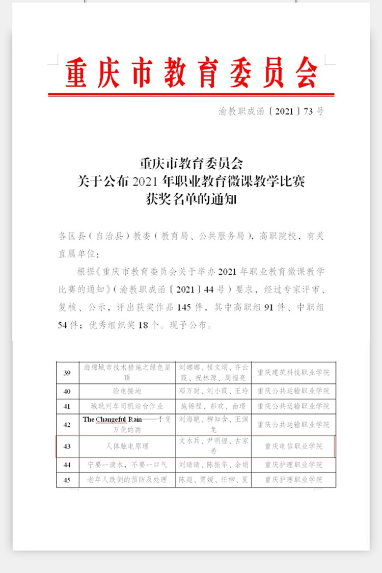 近日,从《重庆市教育委员会关于公布2021年职业教育微课教学比赛获奖名单的通知》(渝教职成函〔2021〕73号)文件中获悉,我校尹明锂,古家希 91视频网站在线观看,文水兵三位教师的作品《人体触电原理》荣获2021年职业教育微课教学比赛三等奖。