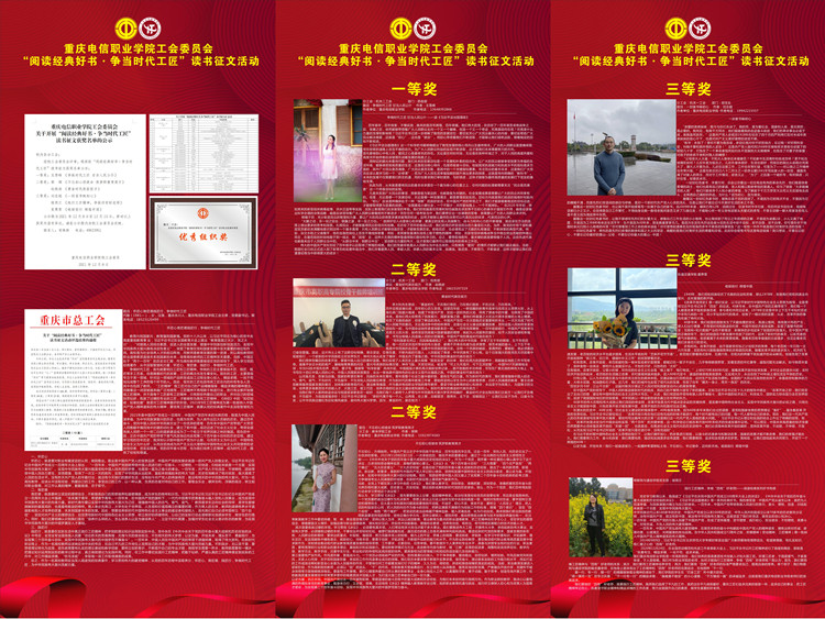 校工会于12月组织开展了“阅读经典好书·争当时代工匠”读书征文评选活动,收到来自七个工会的投稿28篇 91牛,最终6名教师的稿件脱颖而出获得表彰,在本次比赛期间,党委副书记,副校长代敏的征文《怀匠心育匠德践匠行,争做时代工匠》,在重庆市总工会读书征文活动评选中荣获全市二等奖。