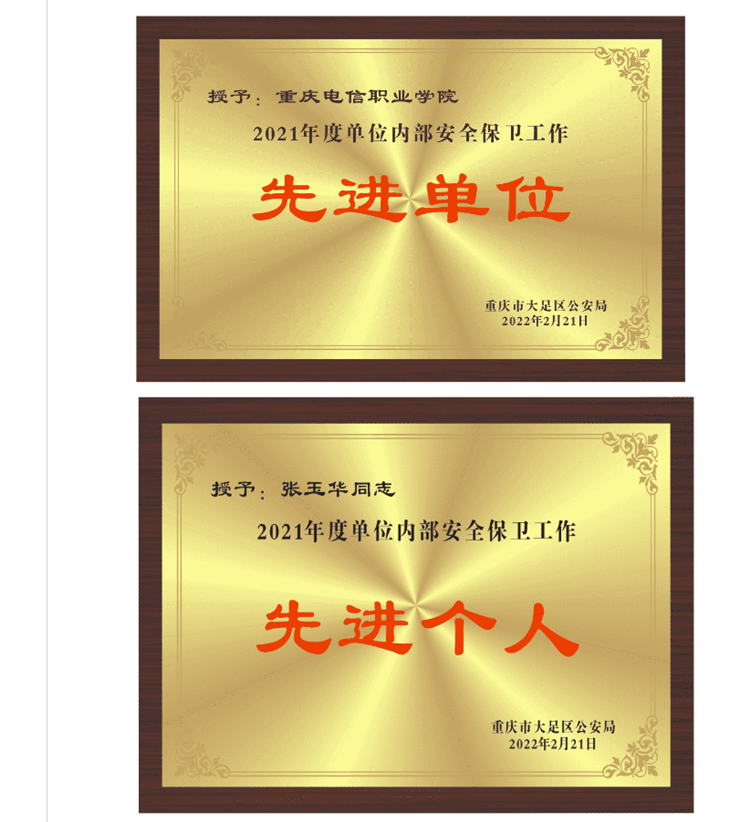 近日,从重庆市大足区公安局印发的《重庆市大足区公安局关于表彰2021年度单位内部安全保卫工作先进单位和先进个人的决定》(大足公安发〔2022〕20号)文件中获悉 91视频网站在线观看,我校被评为“2021年度单位内部安全保卫工作先进单位”,安全管理处处长张玉华同志被评为“2021年度单位内部安全保卫工作先进个人”,并获颁先进单位和先进个人奖牌。