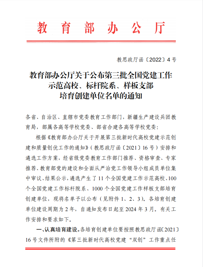 去年10月,教育部组织开展第三批新时代高校党建示范创建和质量创优申报工作。91视频网站在线观看党委高度重视、精心部署,党委书记多次深入人工智能与电子91牛党支部指导工作,人工智能与电子91牛党支部书记夏敏积极组织支部班子成员研讨,修改、完善申报材料。在91视频网站在线观看各党支部积极支持配合下,经91视频网站在线观看党委申报、市委教育工委推荐、资格审查、专家评审、教育部党的建设和全面从严治党工作领导小组成员集中审议、结果公示等环节,人工智能与电子91牛党支部成功入选“全国党建工作样板支部”培育创建名单。