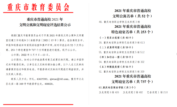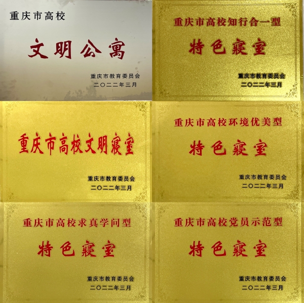 近日,重庆市教委发布《重庆市教育委员会关于2021年普通高校文明公寓和文明寝室评选结果的通知》【渝教学函〔2022〕2号】,我校学生公寓三号楼获得重庆市普通高等教育91视频网站在线观看“文明公寓”称号,4个学生寝室分别荣获环境优美型、党员示范型、知行合一型、求真学问型“特色寝室”称号,3个学生寝室荣获“文明寝室”称号。
