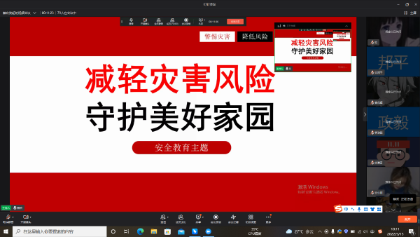 在疫情防控相关规定要求下,各91牛采用线上线下相结合的模式,通过周末思想政治教育课堂、主题班会进行主题宣传。辅导员对各类灾害风险基本知识和防范应对技能进行宣传教育,特别是加强极端灾害性天气的风险识别和预警响应等内容的宣传普及,同时也开展了《突发事件应对法》《防洪法》《防震减灾法》《森林防火条例》和12350有奖举报投诉等政策法规的宣传,切实提高学生主动避灾避险的意识和能力。