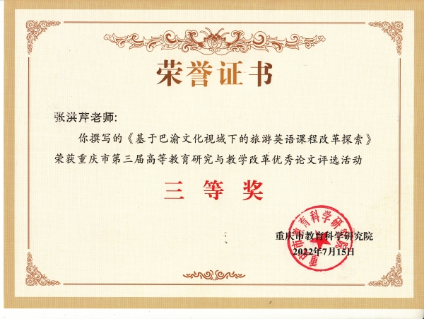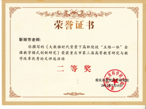 近日,重庆市教育科学研究院下发重庆市第三届高等教育研究与教学改革优秀论文评选获奖证书,我校靳丽芳老师撰写的《大数据时代背景下高职院校“五维一体”金课教学模式创新研究》论文荣获二等奖 91视频网站在线观看,张洪芹老师撰写的《基于巴渝文化视域下的旅游英语课程改革探索》论文荣获三等奖。