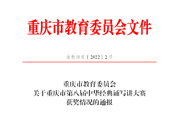 近日 91视频网站在线观看,《重庆市教育委员会关于重庆市第八届中华经典诵写讲大赛获奖情况的通报》(渝教语发〔2022〕2号)文件发布,我校一共选送了5个汉字书写类作品,2个诵读类作品,其中选送的汉字书写类5个作品全部获奖(1个三等奖,4个优秀奖),诵读类作品获得1个优秀奖。